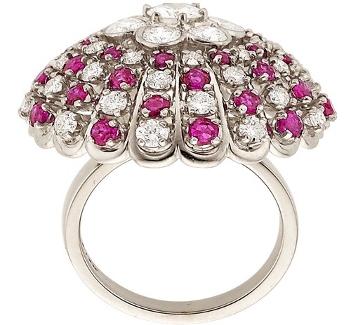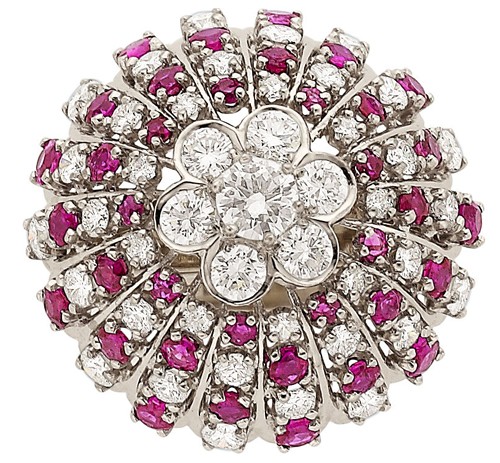 Diamond, Ruby, White Gold Ring The ring features full-cut diamonds weighing a total of approximately 1.85 carats, enhanced by round-shaped rubies weighing a total of approximately 1.00 carat, set in 14k white gold. Gross weight 14.00 grams. Size: 5-1/2 (sizeable) Condition Report*: Diamond Average Color: G-H-I Diamond Average Clarity: VS Diamond Shapes: Full-cut Diamond Count: 26 - 50 Gem Type: Ruby Gem Average Clarity: Good Gem Shape: Round-shaped Gem Count: 26 - 50 Overall Condition: Very Good Notes: One ruby is chipped.