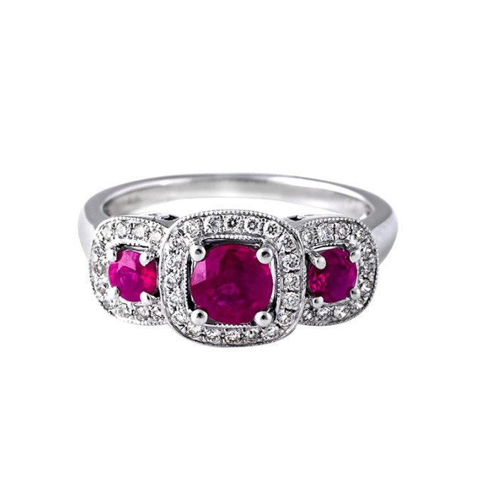 14k White Gold Ruby and Diamond Three Stone Ring