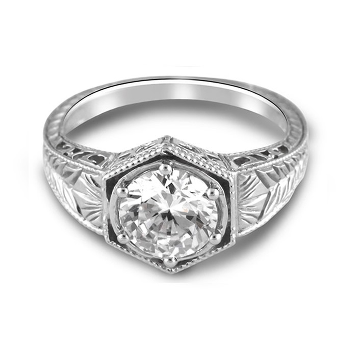 14K White Gold Antique Hand Engraved Engagement Ring